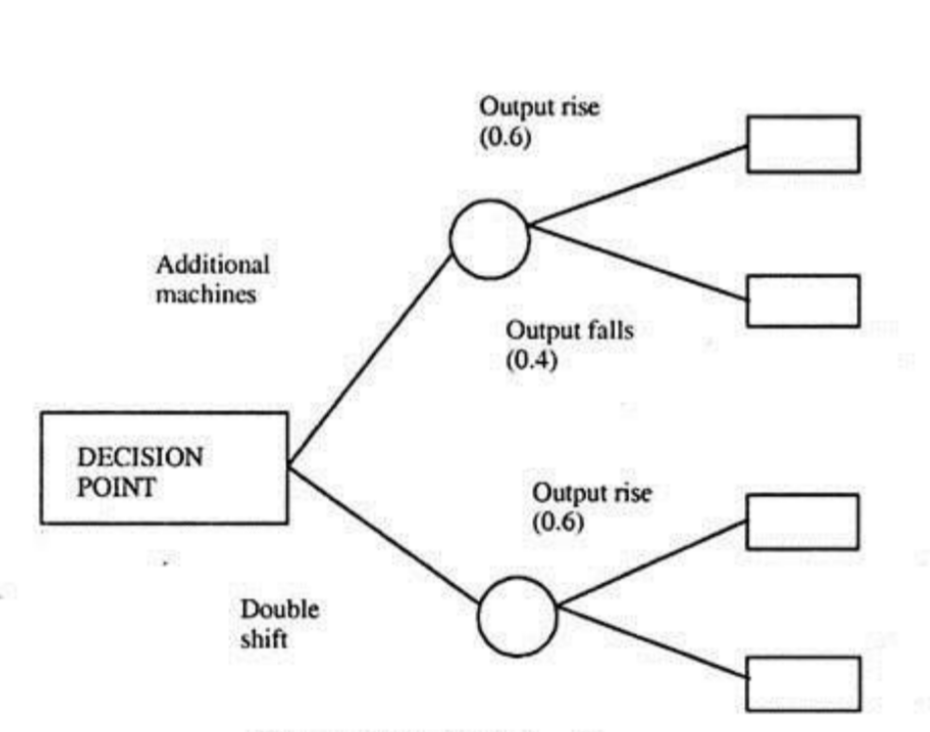 In this technique, the decision-maker traces the optimum path through the tree diagram. In the tree diagram the base, known as the ‘decision point,’ is represented by a square. Two or more chance events follow from the decision point. A chance event is represented by a circle and constitutes a branch of the decision tree. Every chance event produces two or more possible outcomes leading to subsequent decision points.