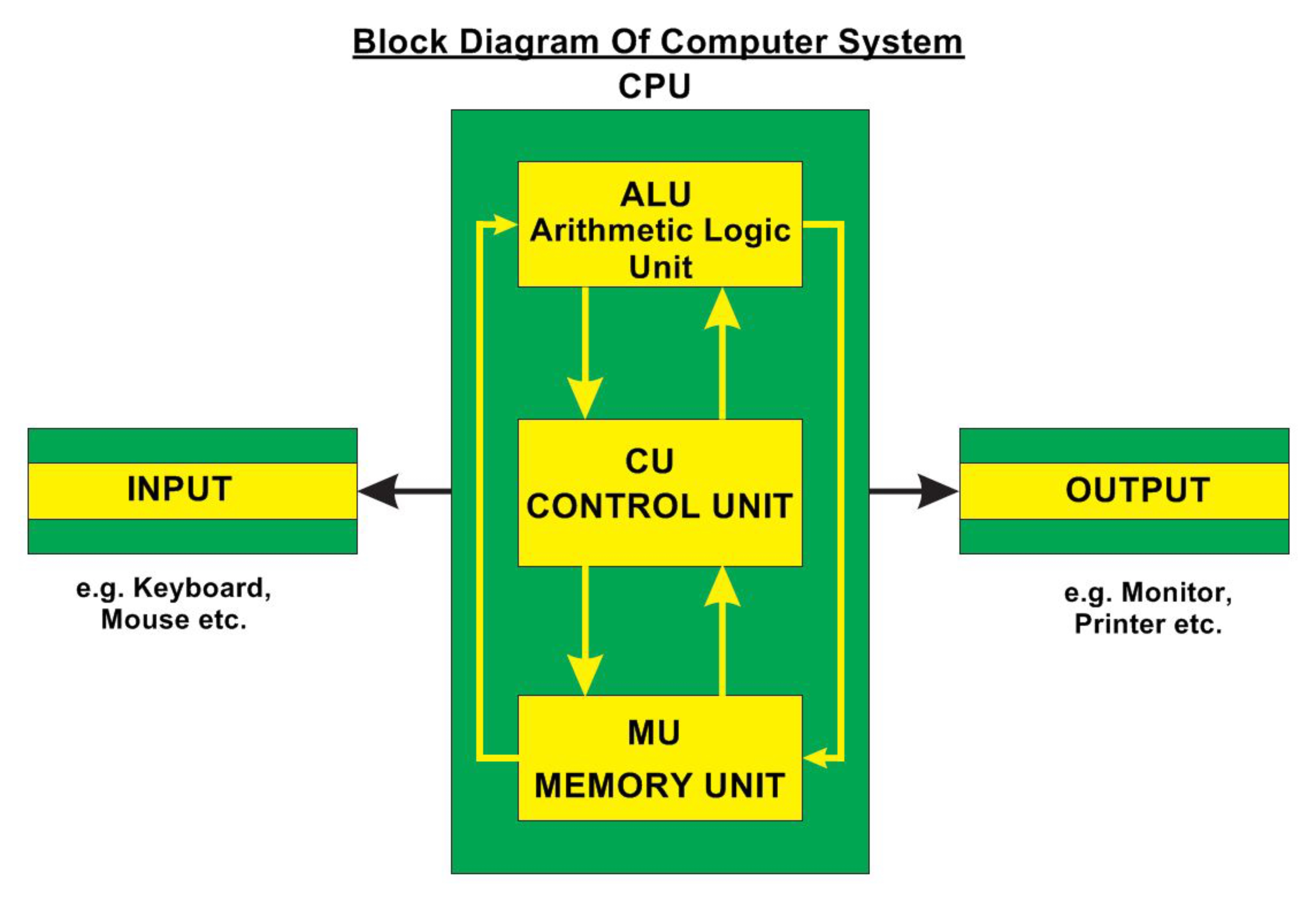a) Arithmetic and Logic Unit (ALU): The ALU, as its name suggests performs mathematical calculations and takes logical decisions. Arithmetic calculations include addition, subtraction, multiplication and division. Logical decisions involve the comparison of two data items to see which one is larger or smaller or equal.