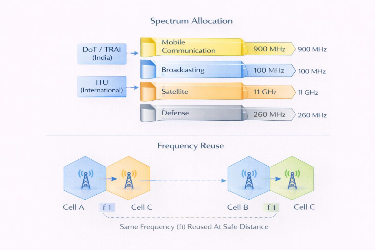 Every wireless service—such as mobile phones, radio, TV broadcasting, satellite communication, Wi-Fi, and Bluetooth—uses a specific part of the spectrum. Since the spectrum is finite and limited, it is considered a valuable natural resource. If it is not managed properly, signals can interfere with each other, leading to poor quality of service or even complete communication failure.