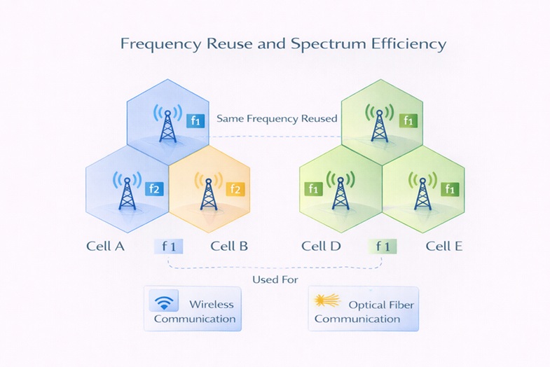 Because spectrum is limited, modern communication systems must use it as efficiently as possible. One very important technique to improve efficiency is frequency reuse, especially in cellular systems.