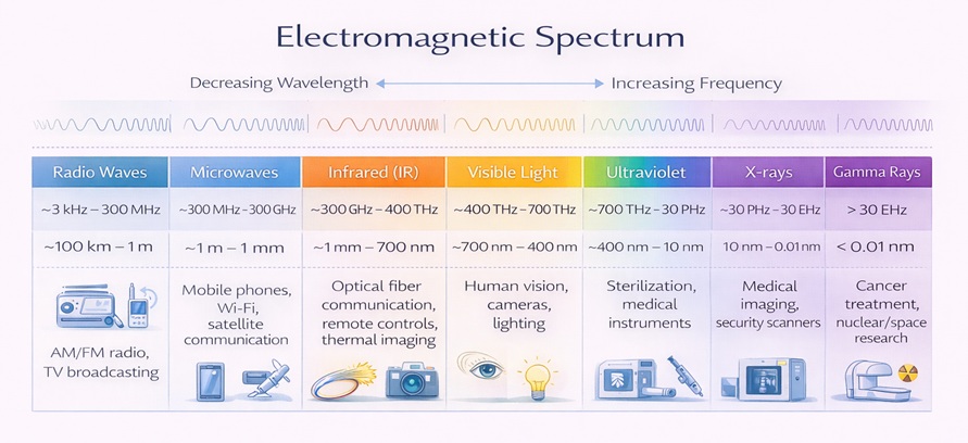 The electromagnetic spectrum is the range of all possible electromagnetic frequencies that can be used for communication. This includes radio waves, microwaves, infrared, visible light, and higher frequency bands. In telecommunications, we mainly use the radio and microwave portions of the spectrum for wireless communication and optical frequencies for fiber communication.