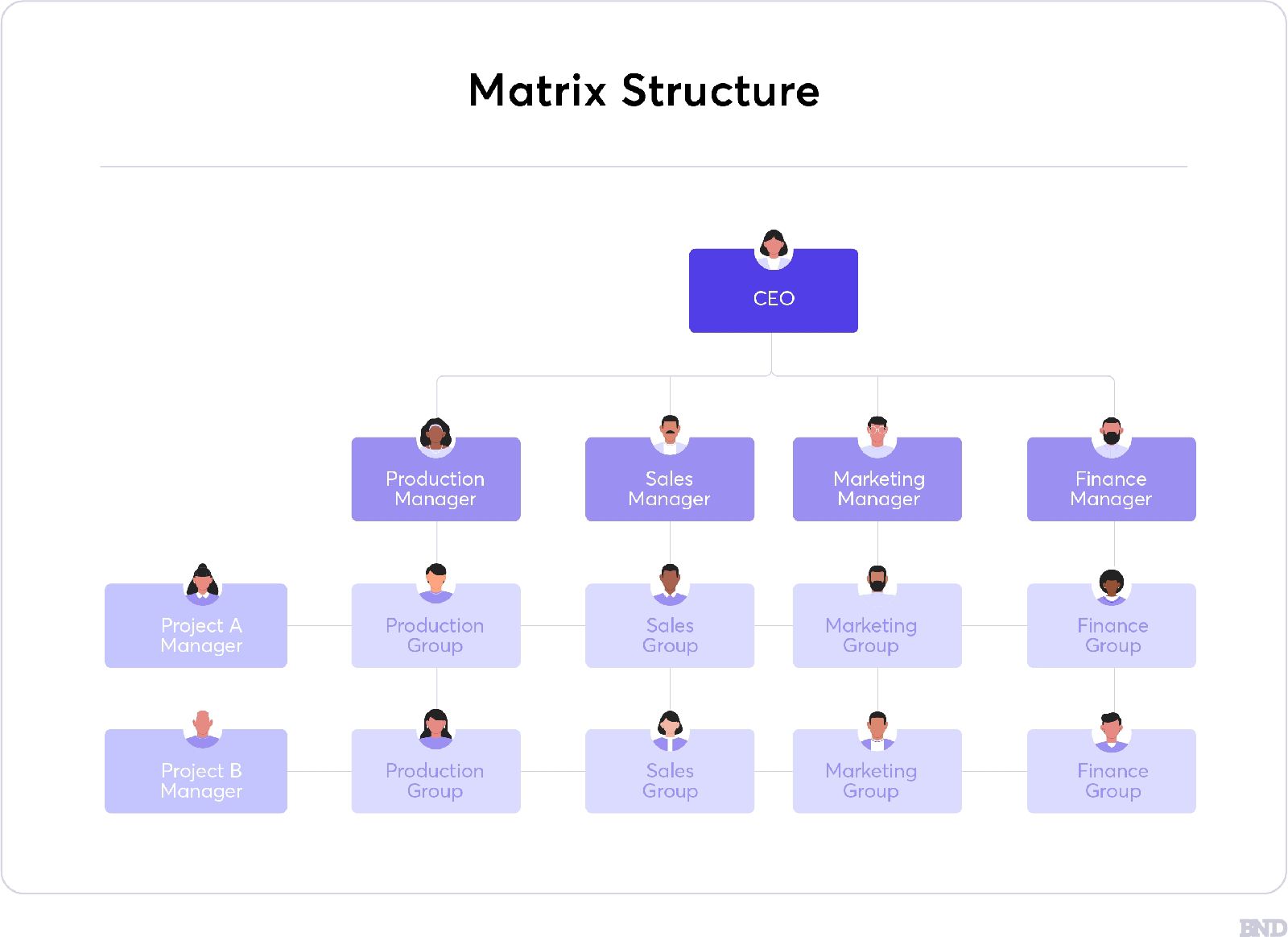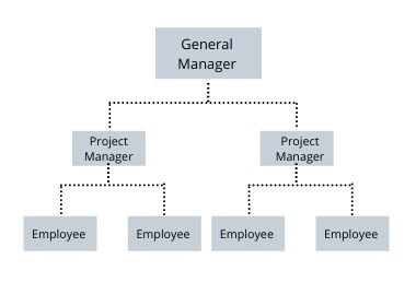 This structure combines functional and divisional approaches. Employees report to both a functional manager (based on job function) and a project manager (based on the project they are working on).