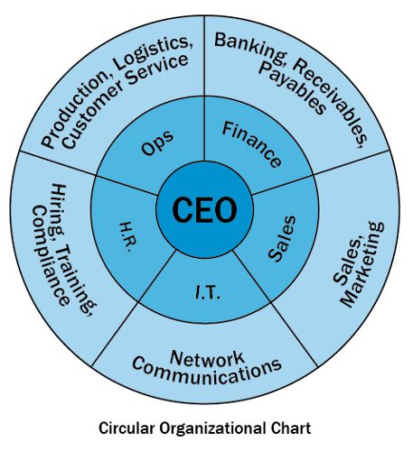 The circular structure emphasises communication and collaboration, with higher levels of management at the centre radiating outward to lower levels.
